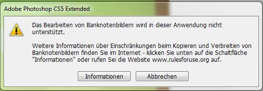 Kaum zu glauben, aber wahr: Es gibt Motive, die darf man nicht mit dem führenden Foto-Tool bearbeiten. Und zwar Banknoten. Wer Banknoten oder Bilder mit Banknoten öffnen möchte, erhält eine schräge Fehlermeldung in Photoshop CS 5. Die ist so schön, dass ich davon sogar einen Screenshot einbaue.