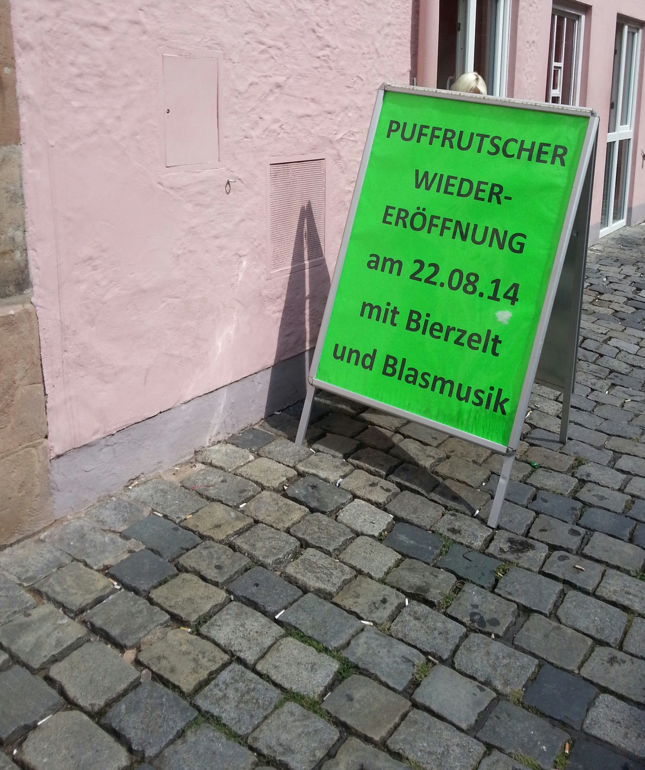 In einer mittelfränkischen Metropole findet sich, nicht weit vom Heimwerkermarkt entfernt, diese Werbeanzeige. Der Puffrutscher feiert Wiedereröffnung!
