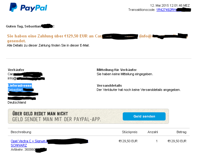 Auch sonst sah die Mail nicht schlecht aus. Zwar stand die falsche Lieferadresse drinnen, aber Vorname und Nachname stimmten. Die ebay-Aktion war tatsächlich vor weniger Zeit erst beendet worden. Alles sprach also dafür, dass jemand sich unter meinem Namen, aber an eine andere Lieferadresse Dinge bei ebay ersteigert und anschließend über meinem Paypal-Account bezahlt hat.