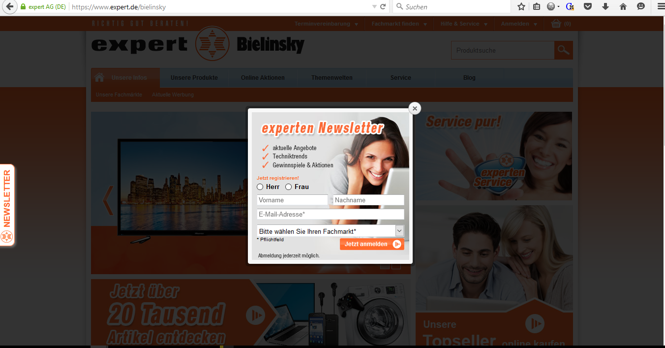 “Tragen Sie sich in unseren Newsletter ein!” ruft dieses Fenster. Das X ist klein, für Tablet-Finger schwierig zu treffen. Immerhin: Ein Klick auf den angegrauten